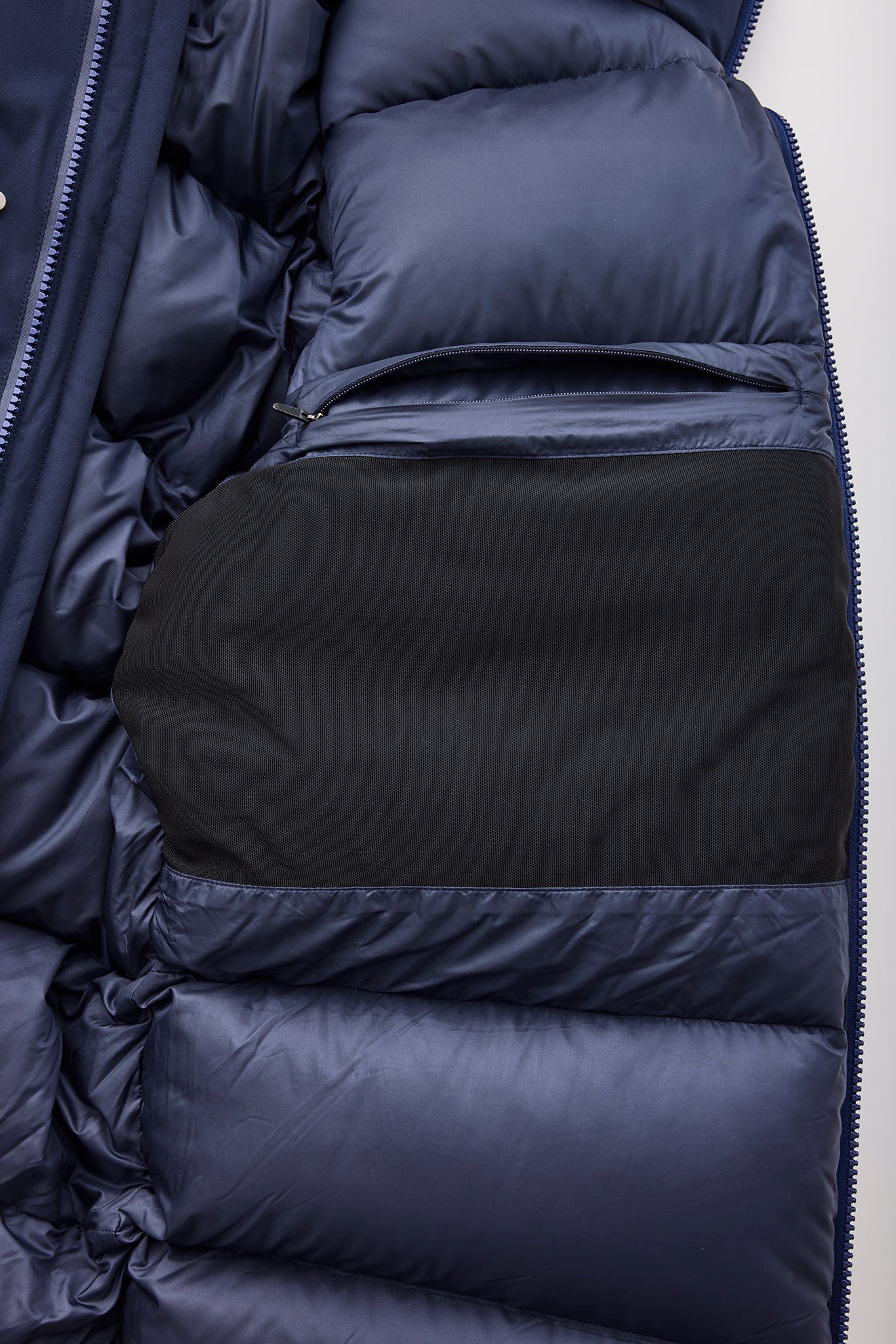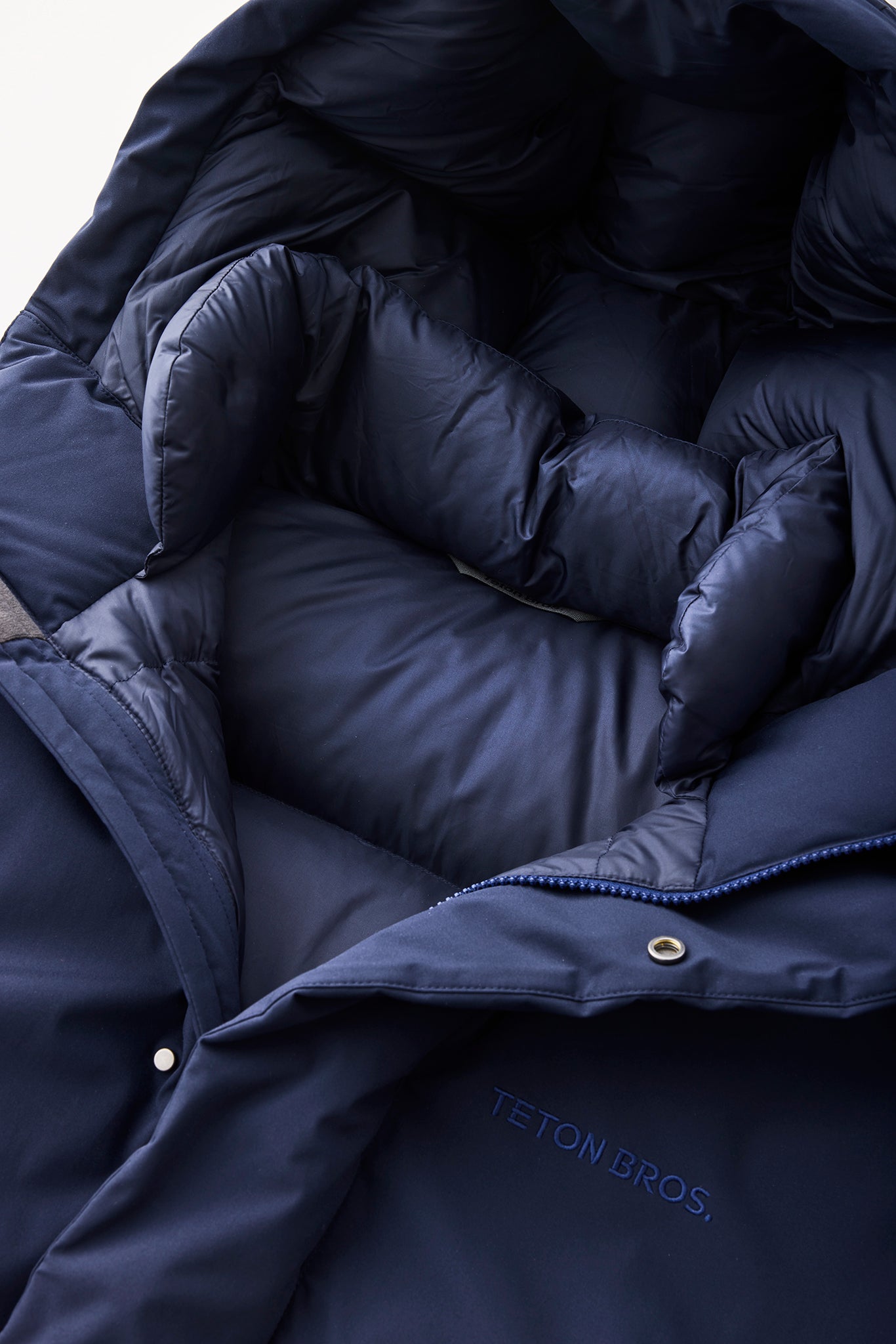 This puffy new piece was born from a staff member's desire for a down jacket that can be worn both in the field and in the city, even in the rain. The outer fabric is the same waterproof and breathable two-layer "Täsmä" as the REFUGE JACKET. The padding is a generous 320g of Allied 850 fill power water-repellent down. The body has a three-layer construction that conceals stitching, which can lead to cold spots. The neck is wrapped in a down tube, the front zipper is covered with a wide flap, and the cuffs are fitted with inner ribbing. Details that enhance the airtight seal shut out cold air from outside while retaining body heat from the inside.