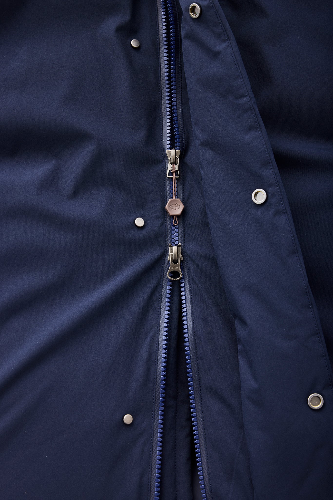 A wide front flap covers the front zipper to prevent cold air from getting in. The zipper has a double slider, so you can leave the zipper open and fasten the buttons to keep out snow and rain while still allowing ventilation. -