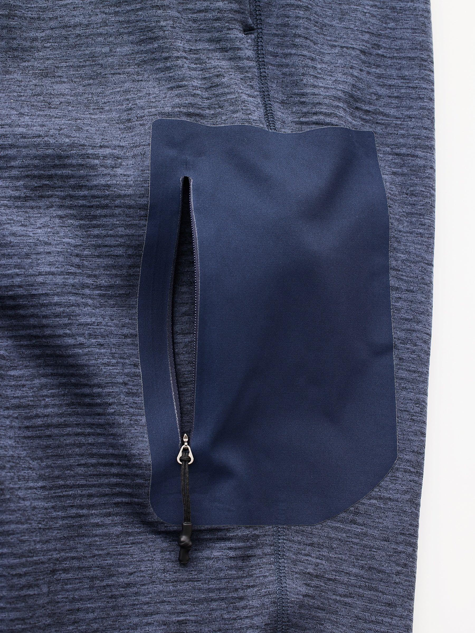 ポケットは3個所。小物の収納に便利なジッパー付き胸ポケットと、両サイドにジッパー付きウェストポケット。 -