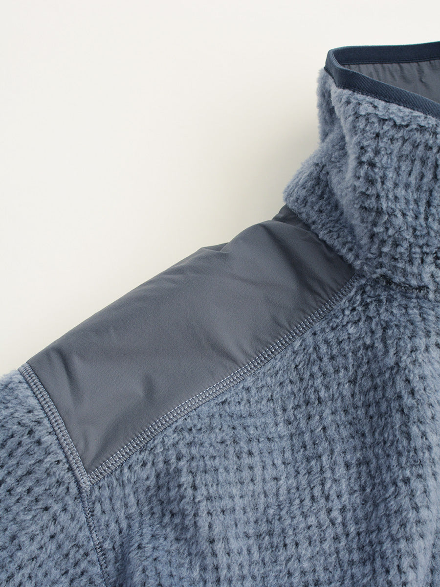 ウールとポリエステルをミックスしたハイロフトフリース素材。ハイロフトフリースの優れた保温性と、ウールの特性の一つである汗冷えの解消を併せ持つ優れた素材です。保温性においては好評なポリエステルハイロフトですが、オーバーヒートした際の化繊特有のひんやり感は、解決すべき問題でした。ウールを採用することにより肌触りはもちろん、軽量で保温性が高く発汗時においても、急激な体温の低下を防ぎます。
