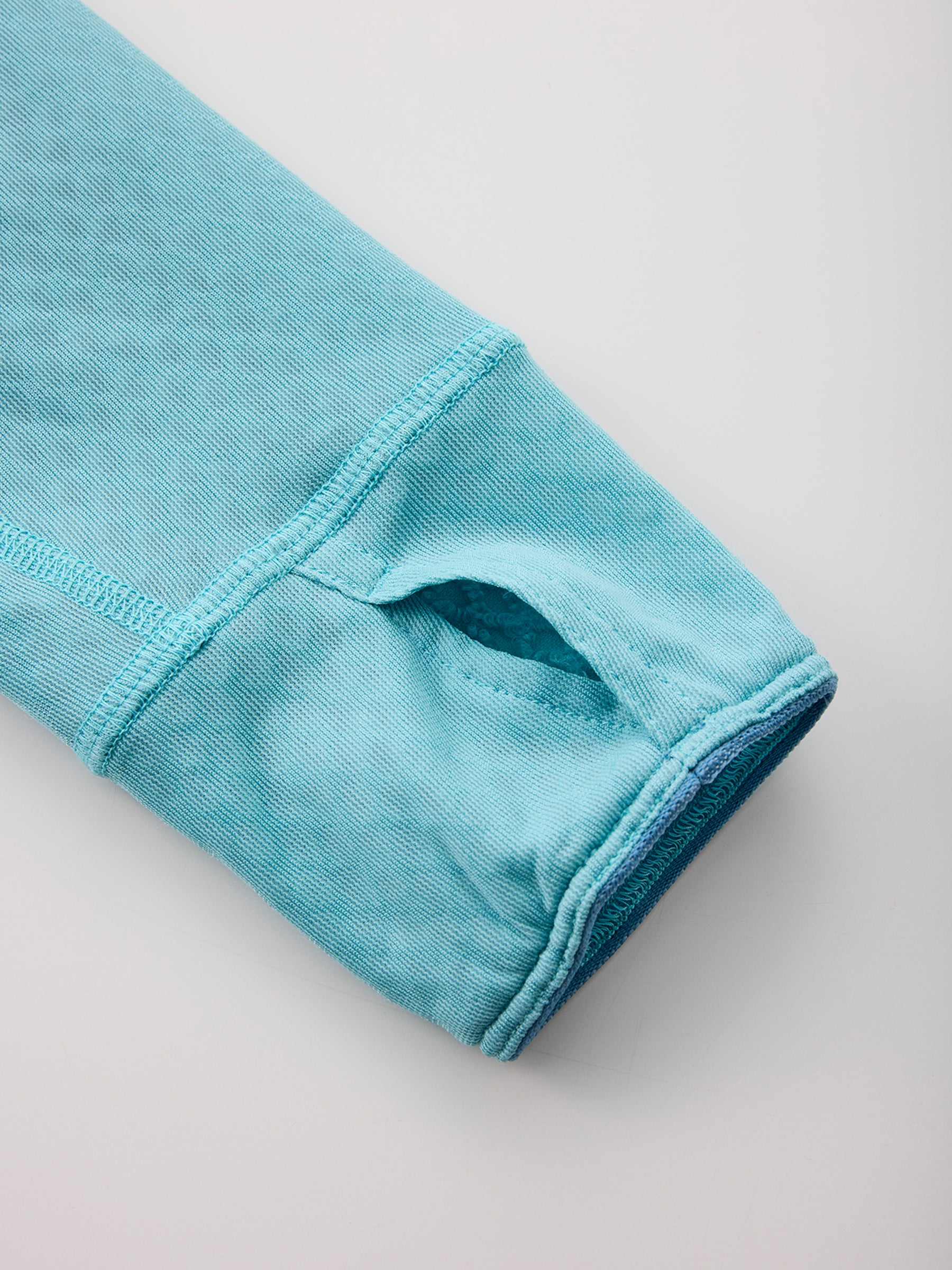 袖口にはサムホールを配置。手の甲の保温性を高め、レイヤリング時の袖のずり上がりを防ぐ。 -