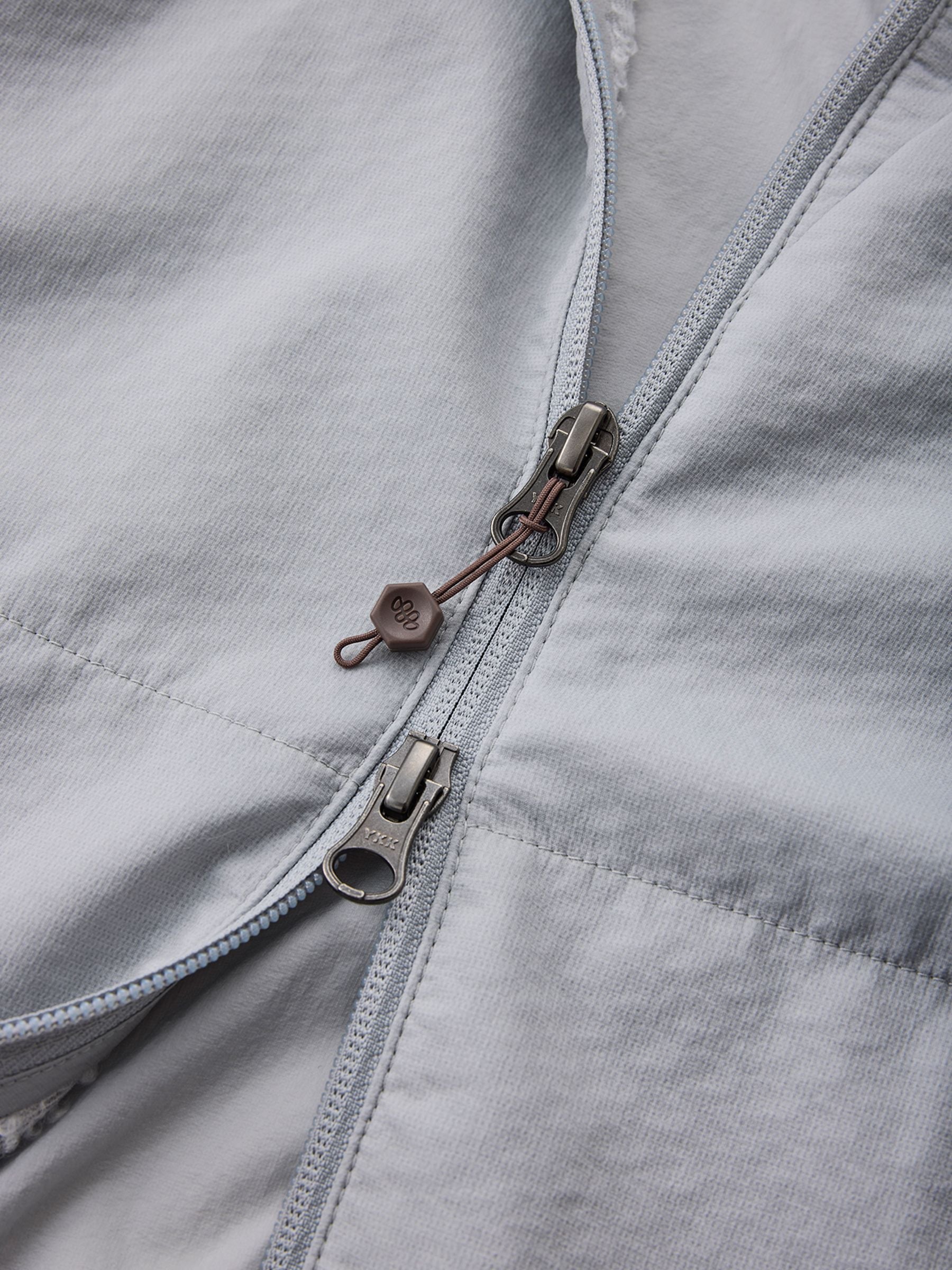 フロントジッパーはダブルスライダー仕様。ハーネスの着用にも対応し、ベンチレーション としても機能する。 -