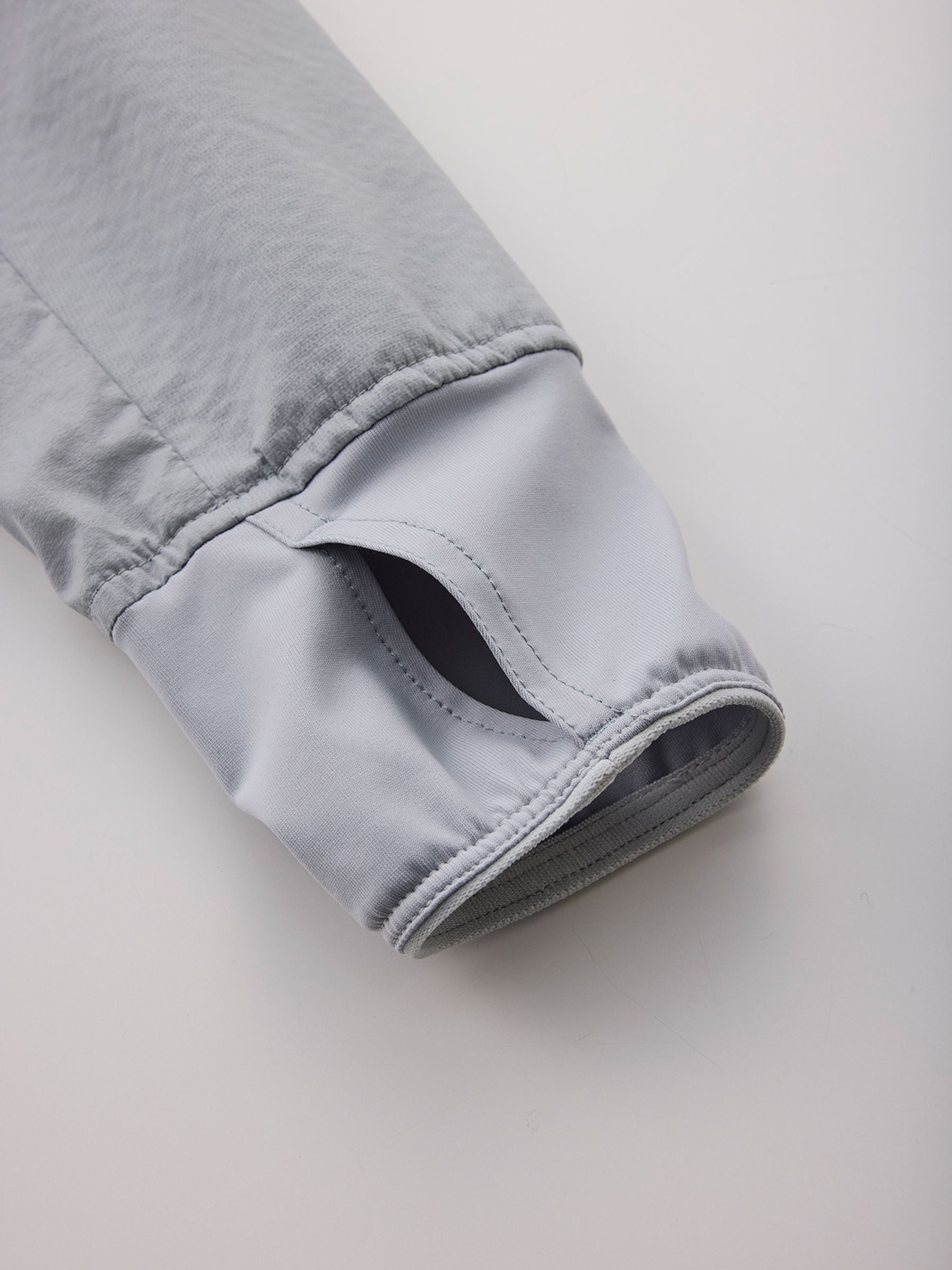 袖口にはストレッチ性と速乾性に優れる素材のサムアンカーを備える。手首にしっかりフィットし、外気の侵入を防ぐ。また、シェルの袖口のベルクロと干渉しないため、レイヤリング時も快適。 -