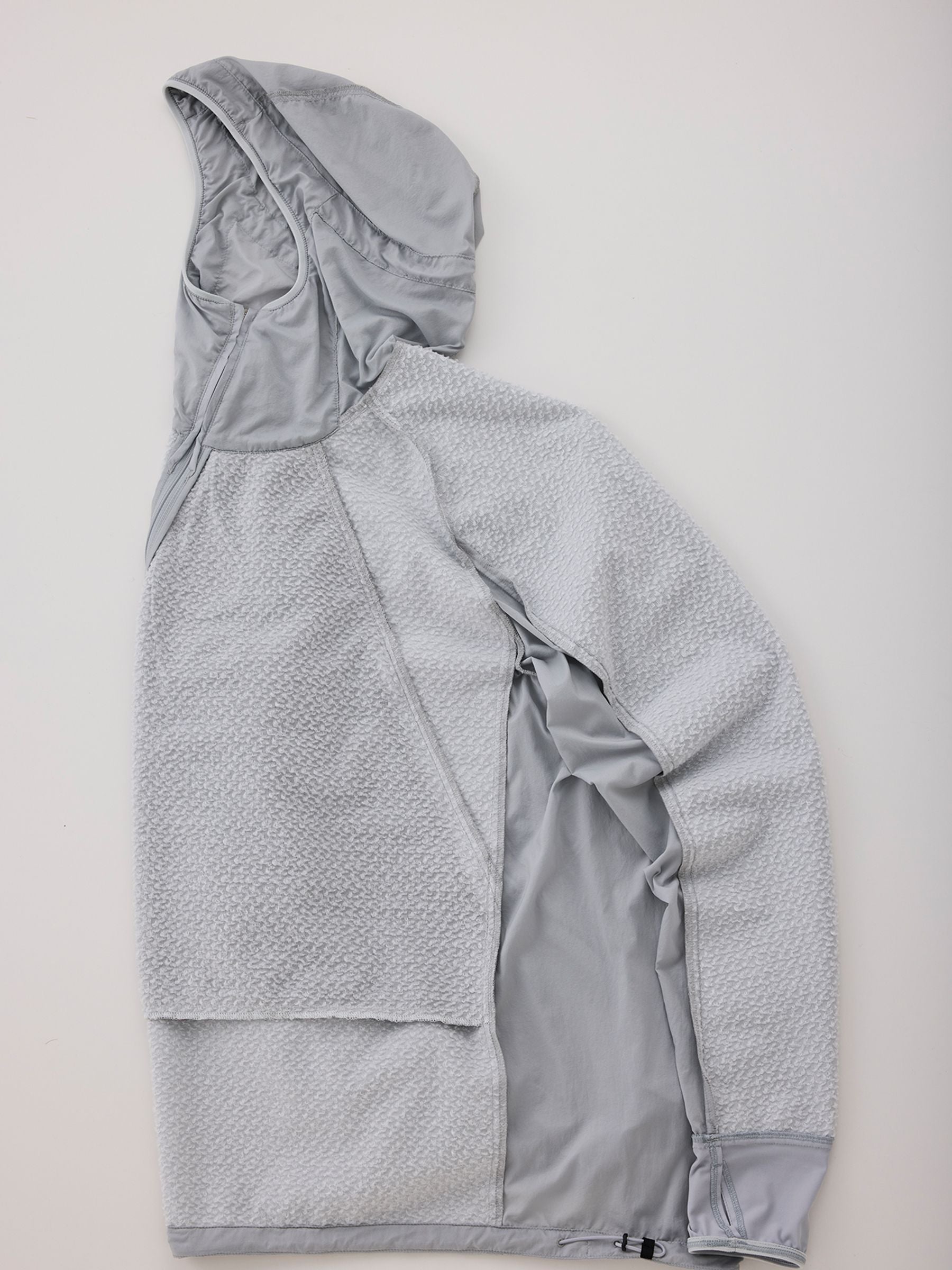 TSURUGI LITE JACKETと同じアングルジッパーを備え、重ねて着ることでベンチレーションが連動し、ウェア内の余分な熱を一気に放出できます。腹部にジッパーがないため、着心地はとても軽やか。 SLICK HOODY同様、「Stretch Octa Bonding」を前面と肩から腕の上部にマッピング。